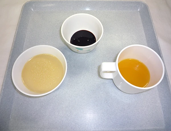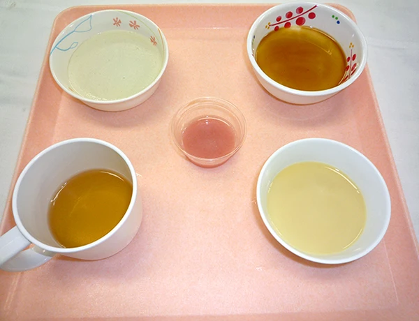 硬さなど、無理なく召し上がっていただけるように、形食(形のある食事)・ケア食(舌で押しつぶせる硬さ)・ペースト食(ミキサーにかけとろみをつけた食事)を準備し、嚥下状態に応じて嚥下調整食を提供しています。また、行事食や季節に応じた食材を取り入れて、変化のある食事提供を心がけています。