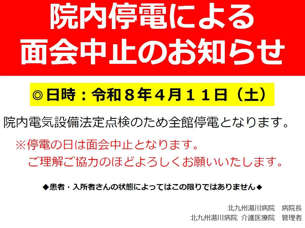 院内停電による面会中止【令和8年4月11日(土)】NEW!