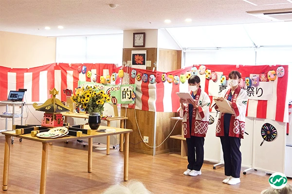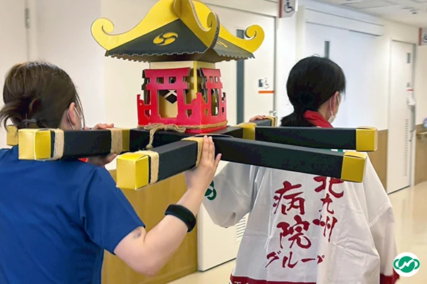 施設内にお祭りの音楽が聞こえる中、今年も職員が担いだお神輿が練り歩き、お祭り気分を一層盛り上げてくれました。