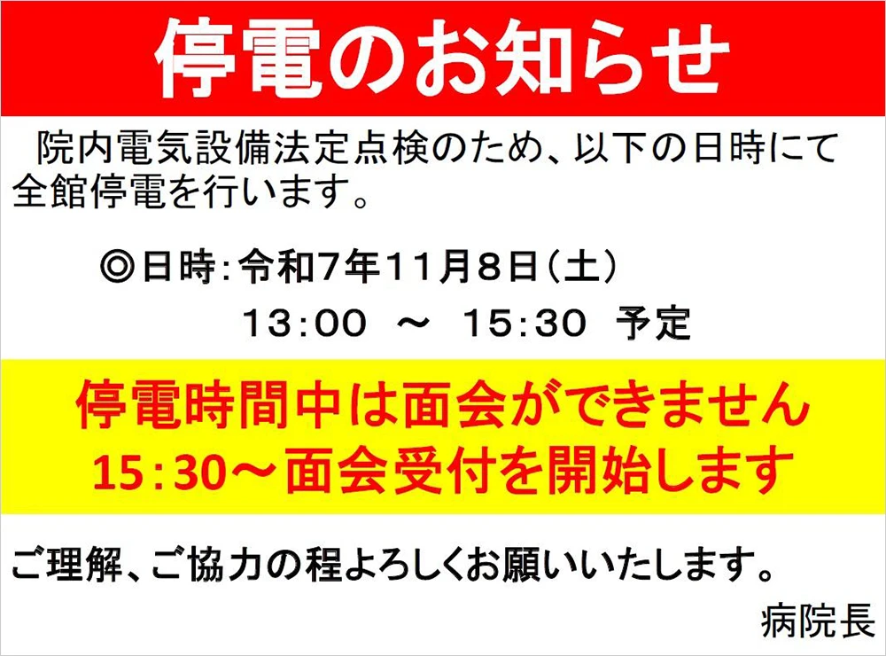 2025年11月8日(土)に院内電気設備法定点検のため、面会時間を15:30~17:00までとなります。