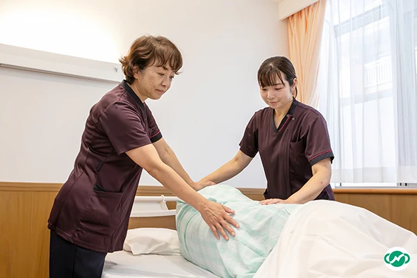 持ち込みの褥瘡や褥瘡発生時は、専任看護師(褥瘡委員長)がベッドサイドに行き、褥瘡の評価や処置の助言・指導を行います。入院時から患者さんや入所者さんに適したマットレスの選択や エアーマットの検討を行います。栄養状態に問題があるときは、NST委員会と連携を図り、解決に努めています。
