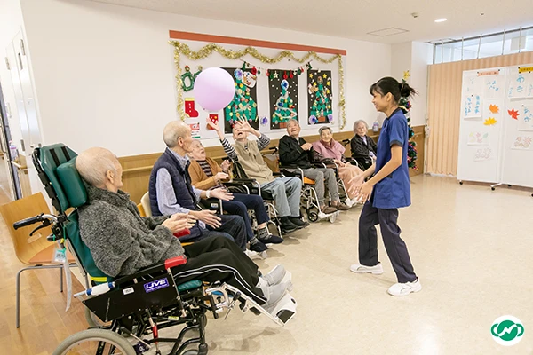 毎週水曜日には、合同レクリエーションを行い、寝たきり状態にならないように離床を促し、寝たきりの入所者の方も参加できるように工夫しいます。